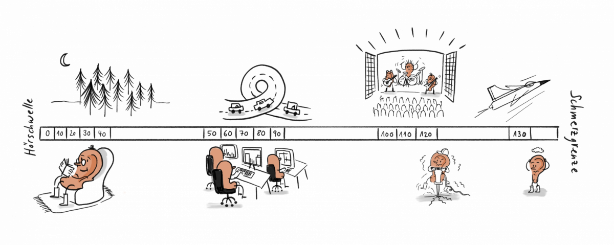 Das menschliche Ohr kann nur einen bestimmten Frequenzbereich und Schalldruckpegel richtig wahrnehmen. Das Hören beginnt etwa bei 20 Hz und endet bei einer Frequenz von ca. 20.000 Hz. Die untere Grenze wird als Hörschwelle und die obere Grenze als Schmerzschwelle bezeichnet.